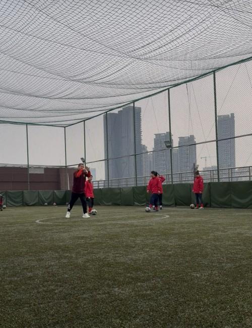 聋人女足的姑娘们,在教学楼顶被绿网包围起来的“空中足球场”训练